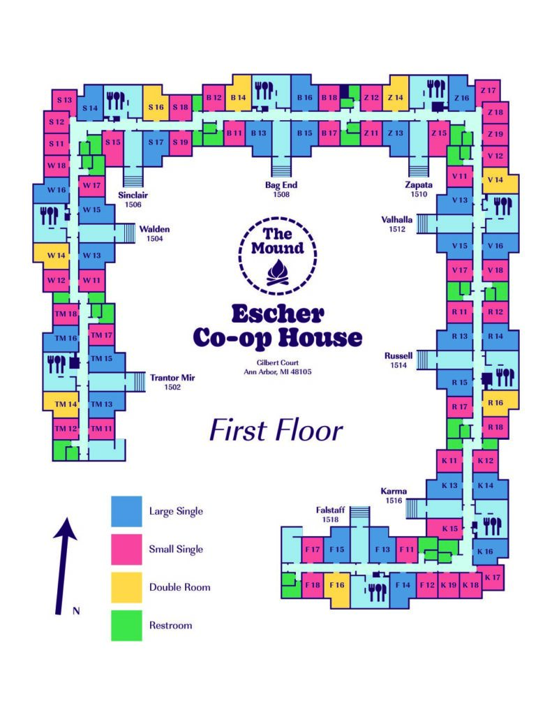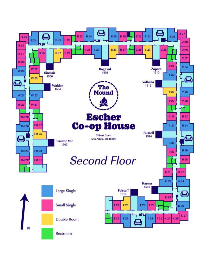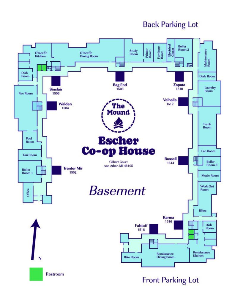 Use Escher Basement Map to find shared/common areas. Use Escher First Floor Map and Escher Second Floor Map to find your room and suite common areas.